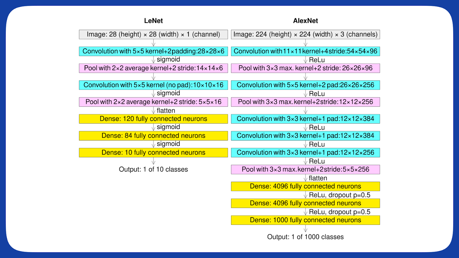 Настоящий прорыв произошел в начале 2010-х. Исследовательница Фэй-Фэй Ли собрала огромную базу изображений — ImageNet. Сотни тысяч людей по всему миру вручную размечали миллионы фотографий. Это дало нейросетям возможность «увидеть» мир во множестве вариантов. В 2012 году трое исследователей — Алекс Крижевский, Илья Суцкевер и Джеффри Хинтон — представили нейросеть AlexNet, обученную на этой базе. Она превзошла все предыдущие алгоритмы в распознавании изображений. Главным отличием было то, что сеть обучалась на видеокартах, способных выполнять вычисления параллельно. Этот момент стал началом современной эпохи искусственного интеллекта.