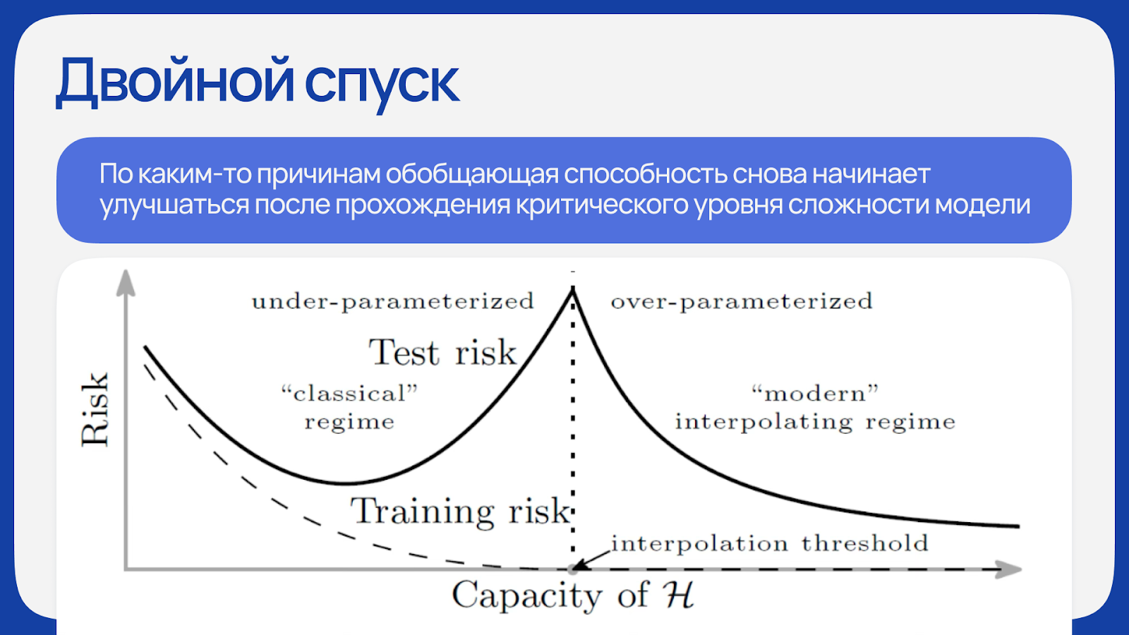 Классической проблемой машинного обучения является переобучение. Это ситуация, когда модель вместо выявления общих закономерностей просто заучивает примеры из обучающей выборки, демонстрируя на них идеальную точность, но плохо работая на новых данных. Исторически считалось, что с ростом сложности модели ошибка на новых данных сначала падает, а потом, после точки переобучения, снова начинает расти. Однако в нейросетях был обнаружен парадоксальный эффект «двойного спуска» — после точки переобучения ошибка снова начинает снижаться. Объясняется это тем, что более сложные модели, вопреки интуиции, находят более простые и общие правила.