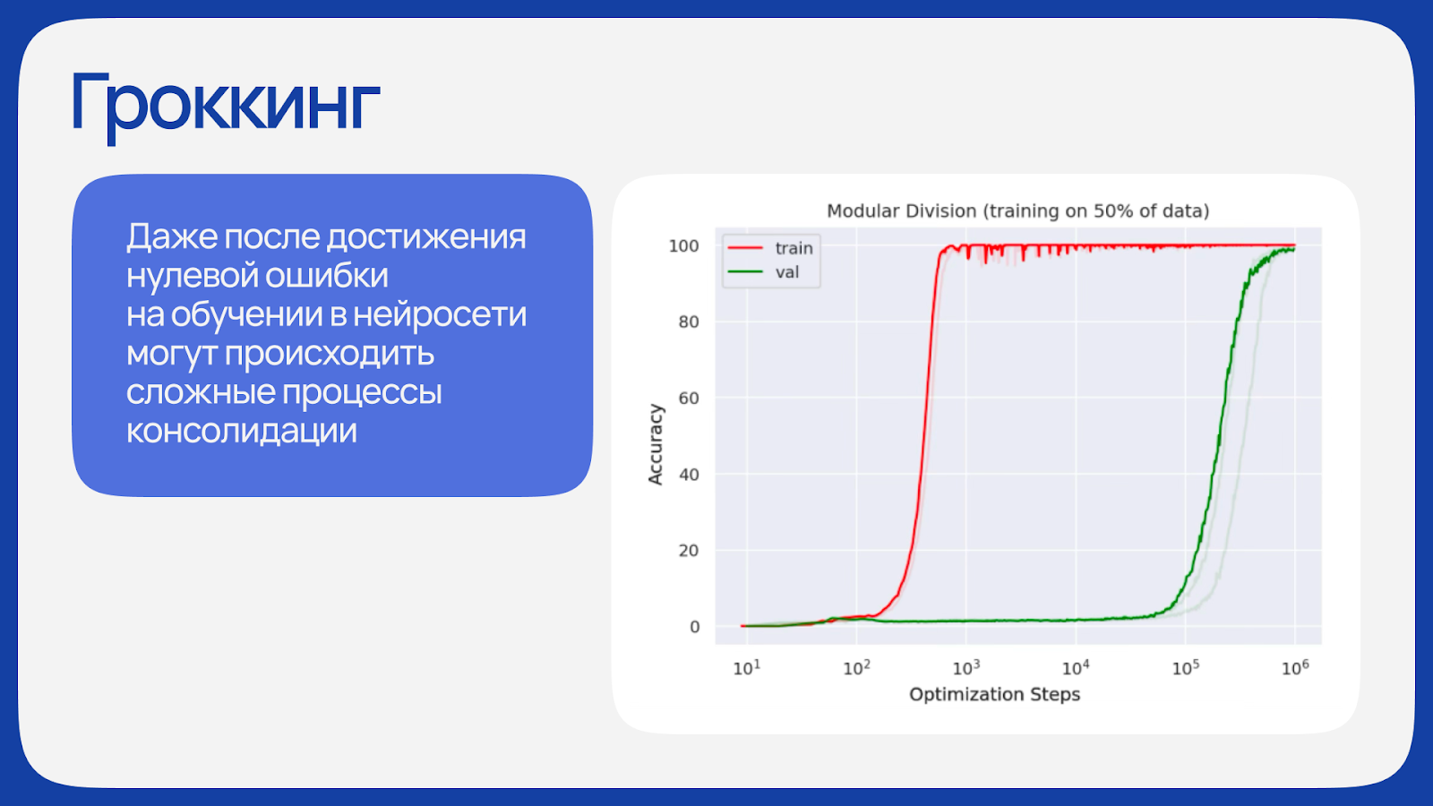 С развитием больших моделей проявились и другие загадочные феномены. Один из них — гроккинг. Модель сначала быстро достигает ста процентов точности на обучающей выборке, что выглядит как катастрофическое переобучение. Но если обучение продолжить, через значительное время, иногда в сотни раз дольше, точность на тестовой выборке внезапно резко возрастает. Модель словно «переосмысливает» выученное, переходя от механического запоминания к пониманию общего правила. Этот эффект мог быть открыт случайно, когда исследователи оставили обучение работать на выходных после того, как модель уже достигла совершенной точности на обучающей выборке.