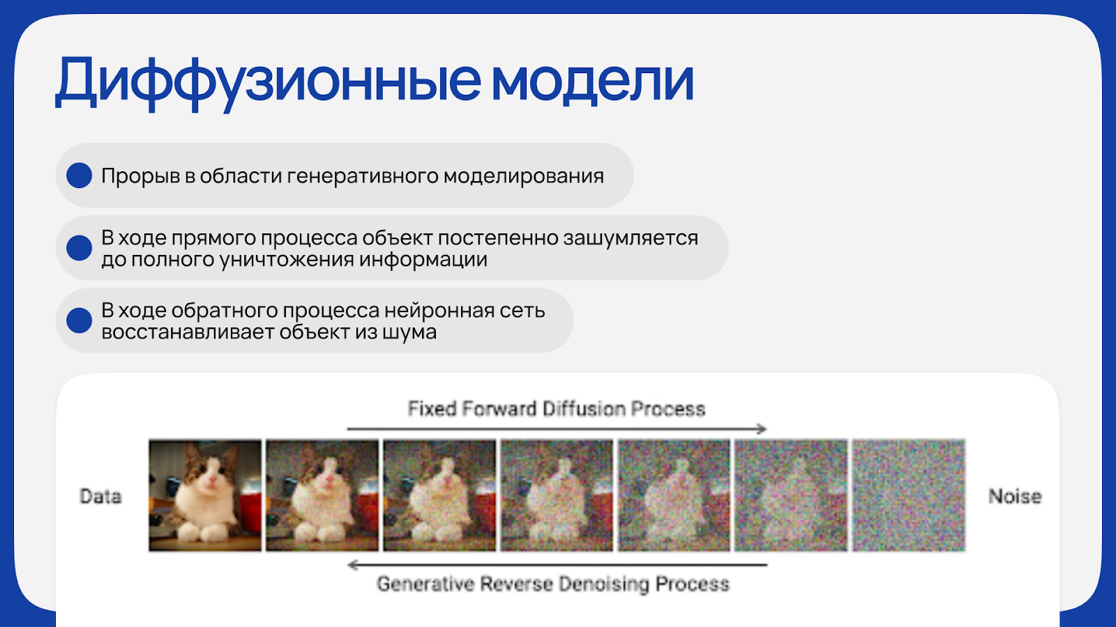 Диффузионные модели — это физически вдохновленный подход, основанный на аналогии с термодинамикой. Прямой процесс — это постепенное «зашумливание» картинки, пока она не превратится в чистый случайный шум, что соответствует росту энтропии. Обратный процесс — это постепенное «очищение» шума для генерации новой картинки, что означает уменьшение энтропии.
