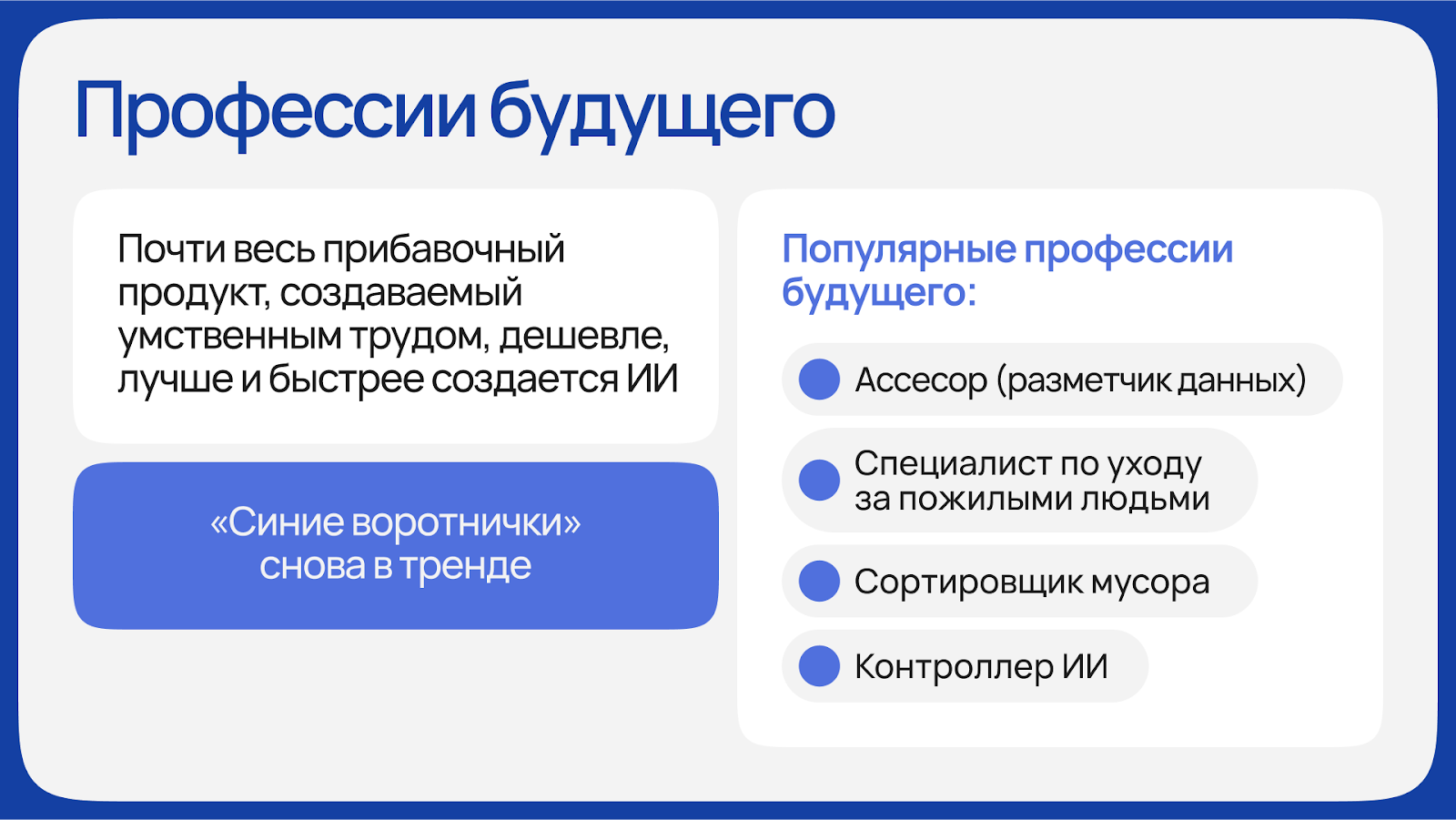 Что касается профессий будущего, то, парадоксальным образом, наиболее защищенными могут оказаться специальности, связанные с ручным трудом и мелкой моторикой — сантехники, сортировщики мусора, сиделки, так как робототехника пока безнадежно отстает в решении этих задач. Робот-рука, способная открыть дверную ручку, считается большим достижением, а завязать шнурки — пока недостижимой целью. Среди новых профессий будущего выделяются ассесоры-разметчики данных, специалисты по уходу за пожилыми людьми и контролеры искусственного интеллекта, которые будут надзирать за его решениями в критических системах.