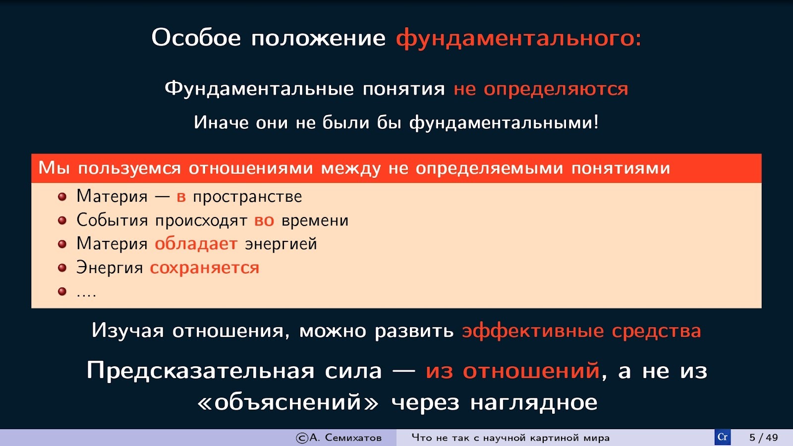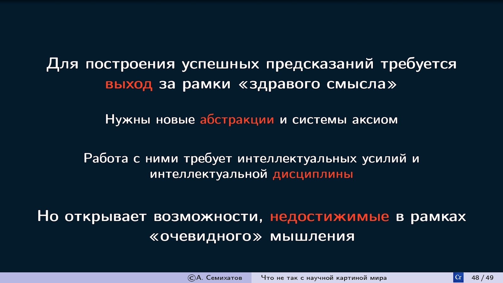 Мне хотелось бы, чтобы вы унесли с собой сегодня понимание простой, но важной истины: современная научная картина мира строится не на поиске понятных и наглядных моделей, а на построении внутренне непротиворечивых математических абстракций. Их ценность определяется не тем, насколько они соответствуют нашему «здравому смыслу», а их способностью точно предсказывать результаты экспериментов.
