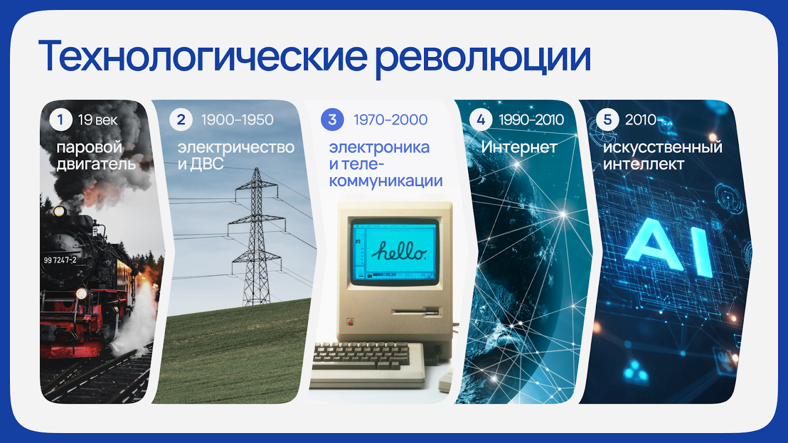 Чтобы понять место искусственного интеллекта, полезно оглянуться на предыдущие технологические уклады. Каждая революция — это комплекс технологий, радикально меняющий жизнь подавляющего большинства людей.
