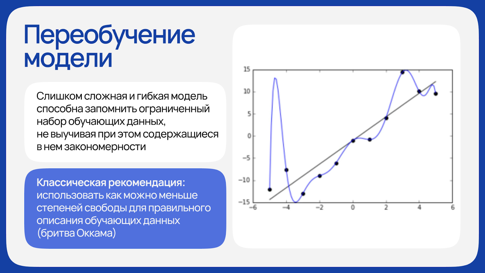 Классической проблемой машинного обучения является переобучение. Это ситуация, когда модель вместо выявления общих закономерностей просто заучивает примеры из обучающей выборки, демонстрируя на них идеальную точность, но плохо работая на новых данных. Исторически считалось, что с ростом сложности модели ошибка на новых данных сначала падает, а потом, после точки переобучения, снова начинает расти. Однако в нейросетях был обнаружен парадоксальный эффект «двойного спуска» — после точки переобучения ошибка снова начинает снижаться. Объясняется это тем, что более сложные модели, вопреки интуиции, находят более простые и общие правила.