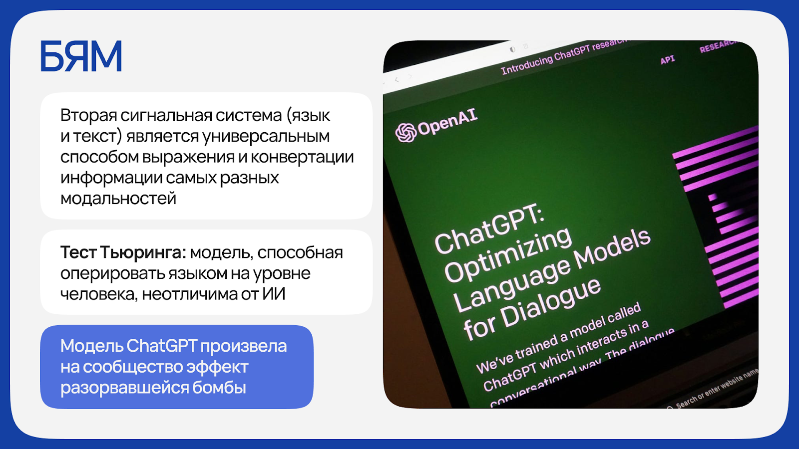 Ключевое их преимущество — способность обучаться на колоссальных объемах текстовых данных. Текст является универсальным носителем информации, в который можно перевести знания практически из любой области. Модели обучаются на задачах предсказания следующего слова или восстановления пропущенных фрагментов текста. В ходе этого обучения они неявно постигают синтаксис, семантику и логику, что позволяет им в дальнейшем генерировать осмысленные тексты, отвечать на вопросы и поддерживать диалог, иногда демонстрируя зачатки юмора и самоиронии. По сути, они становятся агрегаторами коллективного знания человечества, содержащегося в интернете. Обучение часто проходит в два этапа: сначала модель учится восстанавливать пропущенные слова в огромном корпусе текстов, этап предварительного обучения, на котором она постигает «смысл», а затем дообучается на меньших наборах данных «вопрос-ответ» для выполнения конкретных задач. Именно такая комбинация технологий, без единой принципиально новой идеи, но грамотно собранная воедино, привела к появлению ChatGPT. Первая реакция многих специалистов заключалась в недоверии, казалось невероятным, что такая модель не является фейком, за которым стоят живые люди.